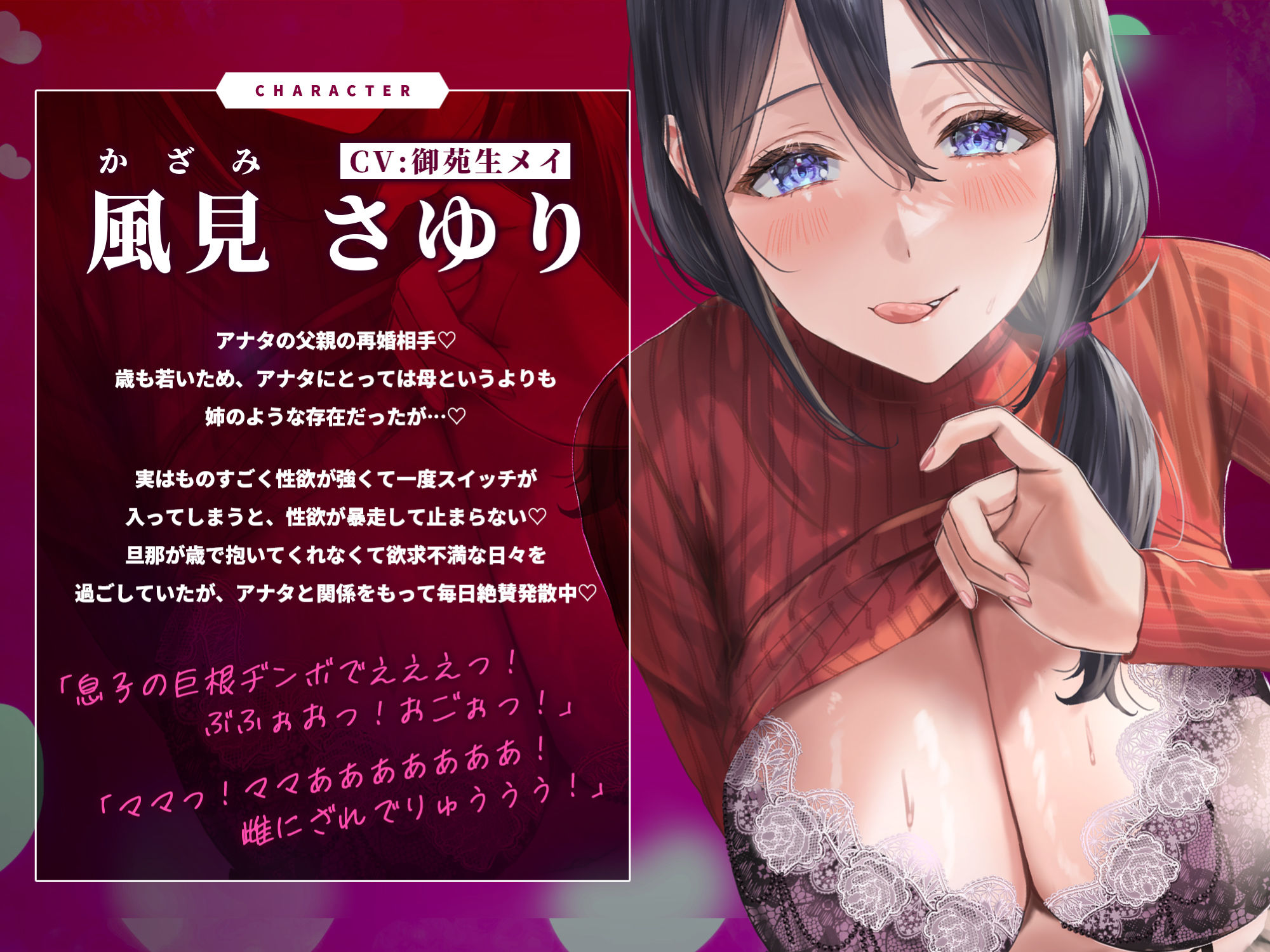 CV:御苑生メイ様演じる、息子とのイケない関係、チンポの虜になっていく義母の姿をお楽しみください…♪